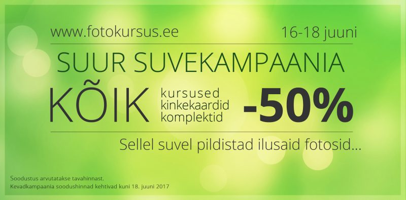Fotokursus.ee on käima lükanud aasta suurima sooduskampaania – kõik fotokursused, sooduskomplektid ja kinkekaardid on vähemalt 50% soodsama hinnaga. Nii suur ja ulatuslik allahindlus leiab fotokursuse õpikeskkonnas aset tõesti vaid kord aastas.
